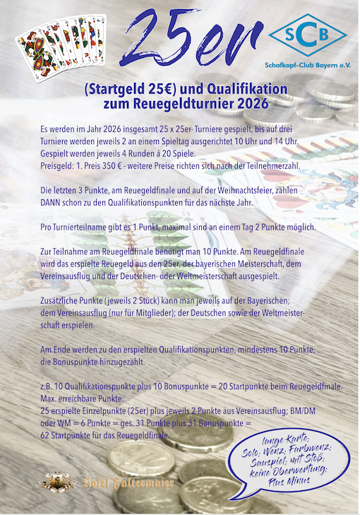 4 Runden a 20 Spiele (Startg.: € 25,00) 1. Preis € 350,00